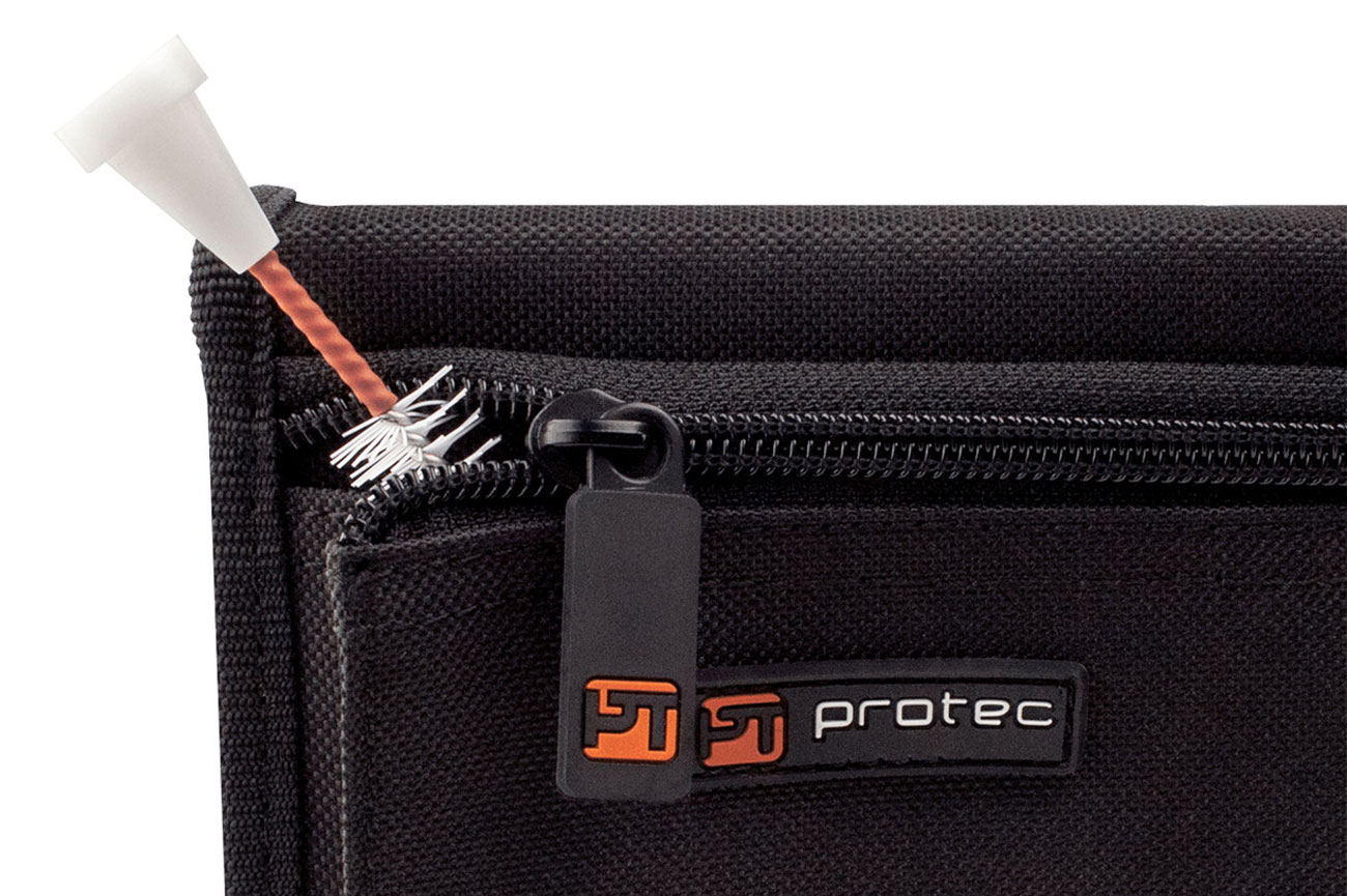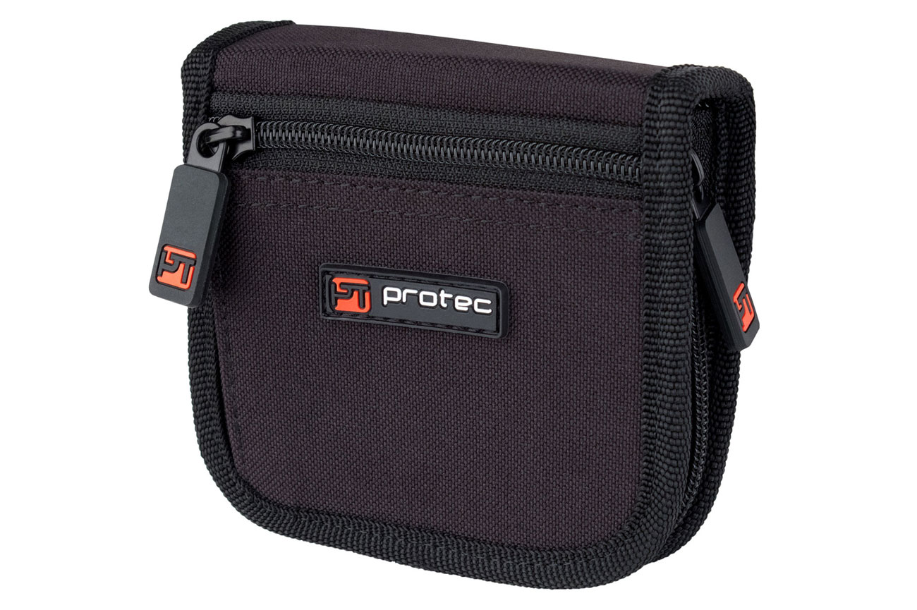 Munnstykkeetui for småmessing i nylon, med glidelås. Denne har plass til tre munnstykker, og er ideell for den som veksler mellom trompet, kornett og flygelhorn, eller for munnstykkeentusiaster. Kan festes i belte. Egen lomme i front med glidelås med plass til for eksempel munnstykkebørste.