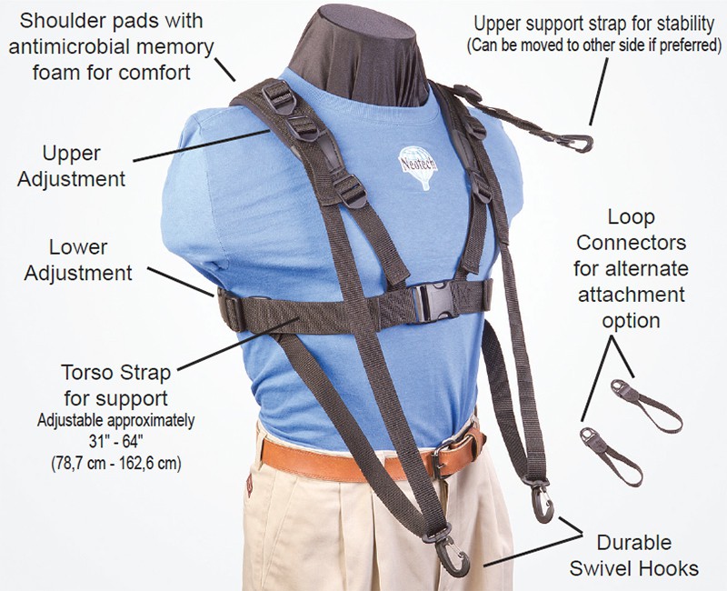 Tubasele fra Neotech, som støtter og stabiliserer tubaen uten å være i vegen når man beveger seg. Komfortable skulderstropper i antibiotisk skum som hjelper med å frakte fukt bort fra huden. Justerbare reimer som kan tilpasses enhver kroppsform og tuba. Tre fleksible fester gjør at den passer til de aller fleste instrumenter.
